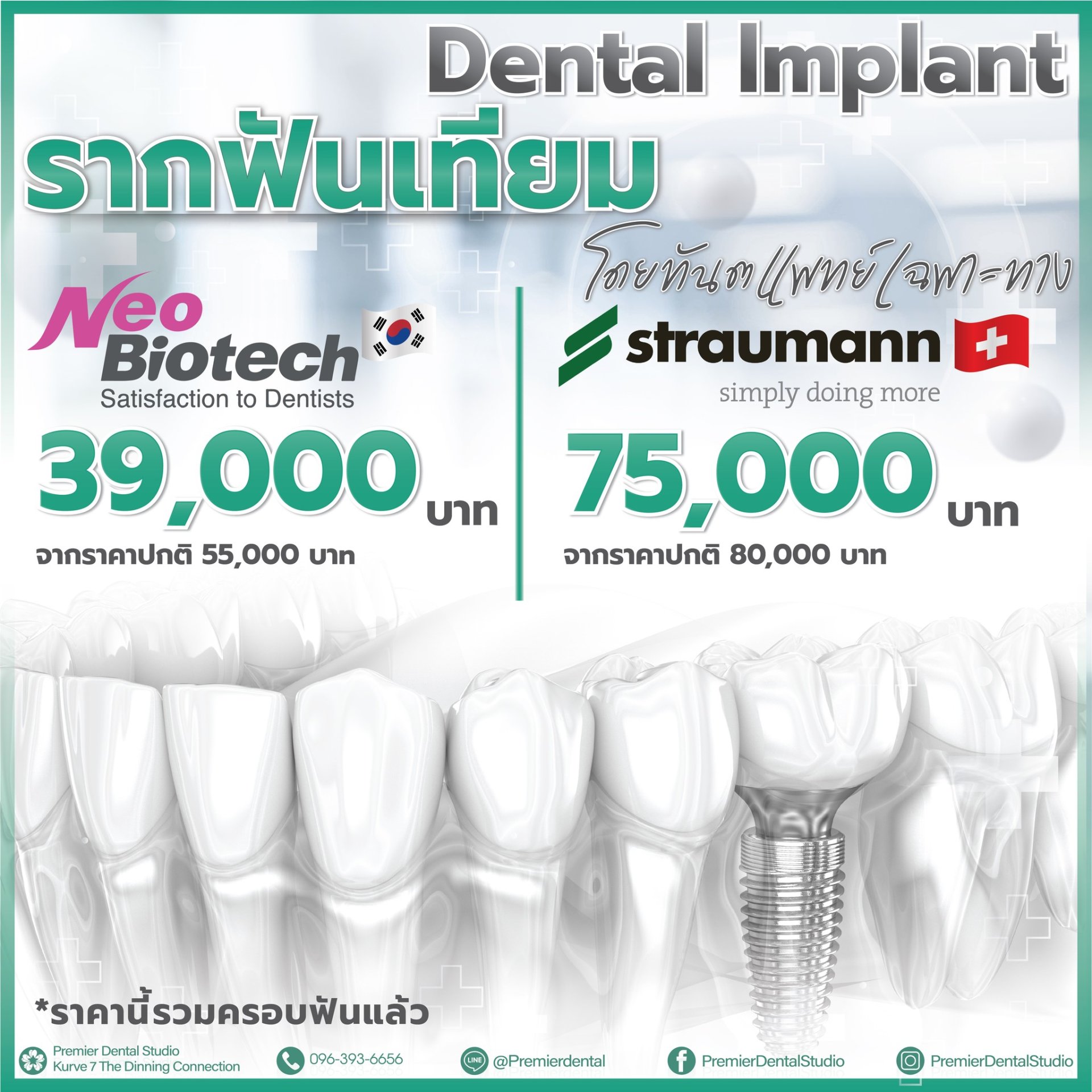 อย่าปล่อยให้ฟันที่สูญเสียไป ทำลายความมั่นใจของคุณ ทำรากฟันเทียมที่ Premier Dental Studio เพื่อเติมเต็มรอยยิ้มให้สมบูรณ์อีกครั้ง ️ รากฟัน + ครอบฟันเซรามิก ช่วยให้คุณยิ้มได้อย่างมั่นใจ ทดแทนฟันแท้ที่หายไป พร้อมอายุการใช้งานที่ยาวนาน Neo Biotech: 39,000 บาท (จากปกติ 55,000 บาท) Straumann (สวิตเซอร์แลนด์): 75,000 บาท (จาก 80,000 บาท) ️ วัสดุมาตรฐานระดับโลก ️ ดูแลโดยทันตแพทย์เฉพาะทางทุกขั้นตอน